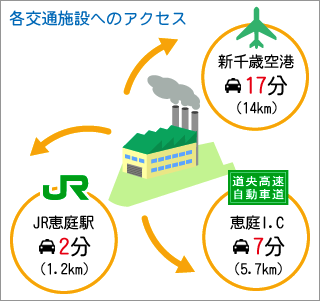 恵庭テクノパークは全国で史上初の土地信託方式を利用した工業団地です。新千歳空港と札幌市の中間に存在しており、JR恵庭駅や高速道路(恵庭インター・チェンジ)までの距離が近いなど、アクセスの面で非常に利便性の高い工業団地です。また取水や電気、通信(インターネット回線)などの設備面も充実しており、現在も多くの企業が操業しています。