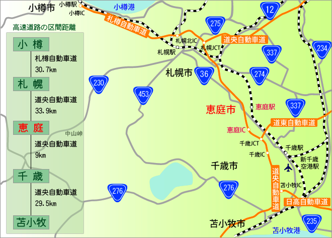 恵庭市の街の中央を通り札幌から室蘭までをまっすぐに結ぶ国道36号線や、道道江別恵庭線(旧国道36号線)、東には恵庭I.Cがあり、道央自動車高速道路が通っています。この充実した3つの大きな道路を利用できること、それが恵庭の車交通での最大のメリットと言えるでしょう。